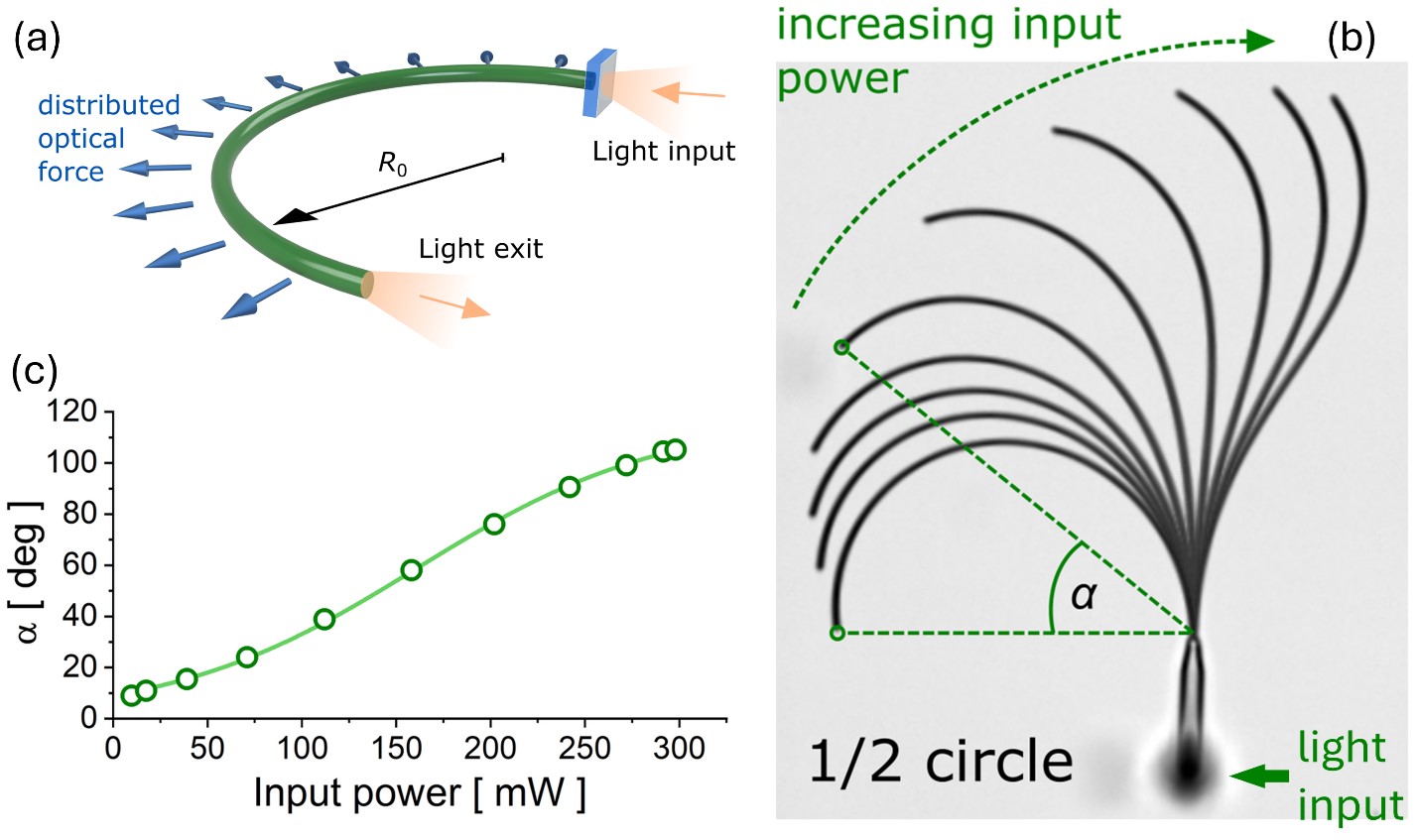 (a) A fényvezető szálba csatolt fény hatására létrejövő deformáció magyarázata. A hajlékony fényvezetőben a becsatolt fény az ív mentén végighaladva a görbülettel arányos, kifelé mutató erőt fejt ki a szálra. (b) Az egyik végén rögzített szál ennek hatására elhajlik. Nagyobb becsatolt fényteljesítmény hatására az eredetileg félköríves szál kiegyenesedik. (c)A kihajlás mértéke közel egyenesen arányosan nő a becsatolt teljesítménnyel.