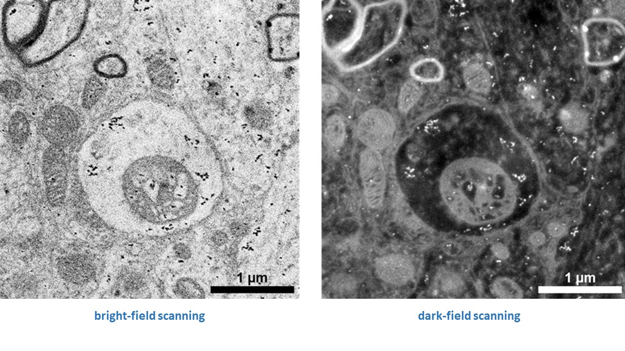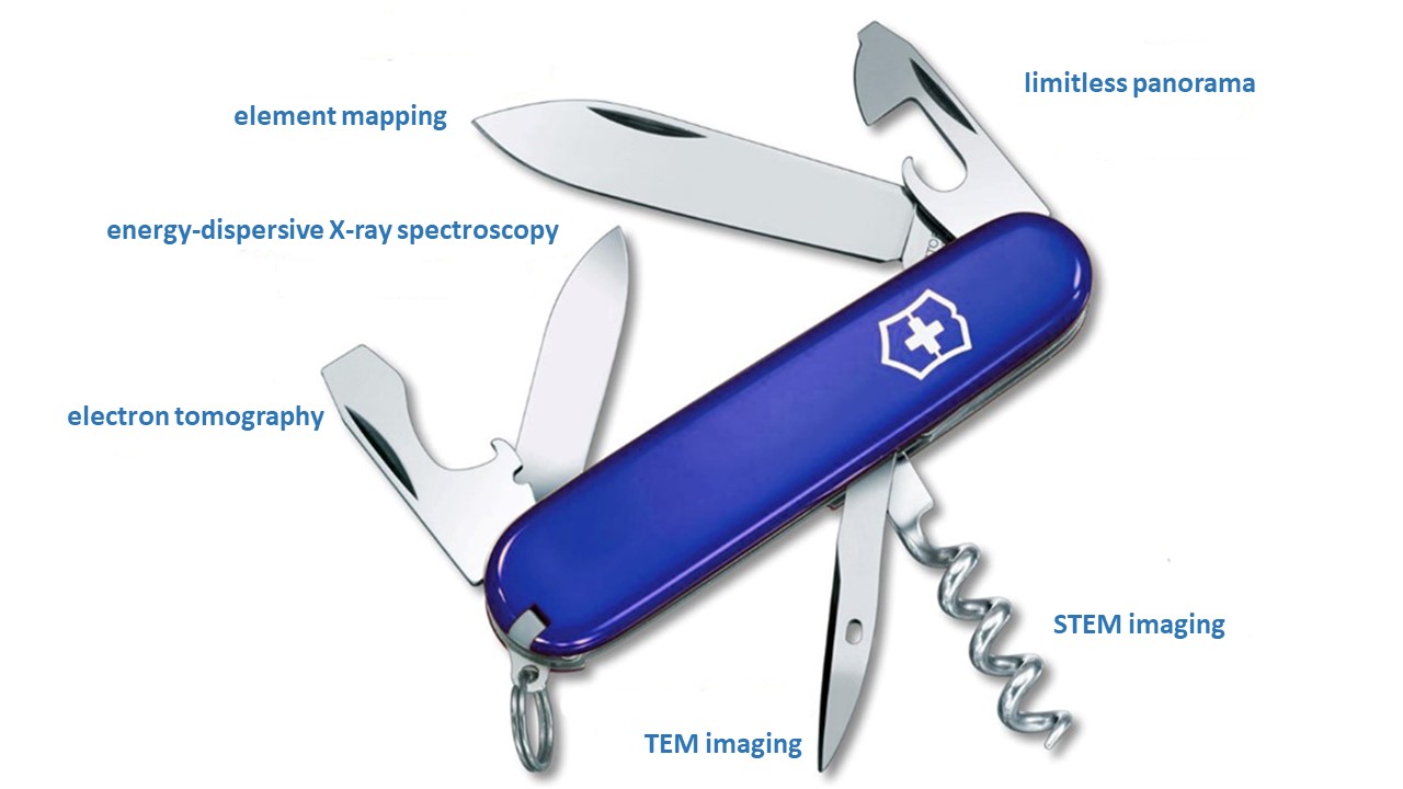 The “Swiss knife” of a system consists of a scanning transmission (STEM), an element analysis (EDS) and a 3D electron tomograph unit and is equipped with two digital cameras.
