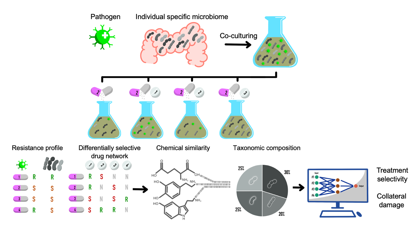 While antibiotics are the main weapons to fight and clear bacterial infection, they can also select for resistant pathogens and disrupt the human gut microflora. Although these ‘collateral damages’ are recognized, we currently lack antimicrobial strategies to break the vicious cycle of antibiotic resistance by counteracting the spread of mobile resistance genes while protecting the integrity of the gut microbiome. This problem is of particular importance in hospital-acquired infections, as resistance genes exist for all known antibiotics in use today and can rapidly spread among clinical pathogens by horizontal gene transfer. Here, we propose a novel approach combining multidrug screens, laboratory evolution, metagenomics and cultivation-based phenotyping of individual-specific microbiomes to discover novel differentially selective treatment strategies for high-risk clinical infections. First, we are using a high-throughput cell viability screening approach to identify conserved and robust “selection-inverting” antibiotic combinations that can be used to clear resistant pathogens orders of magnitude more efficiently than its susceptible counterpart.
