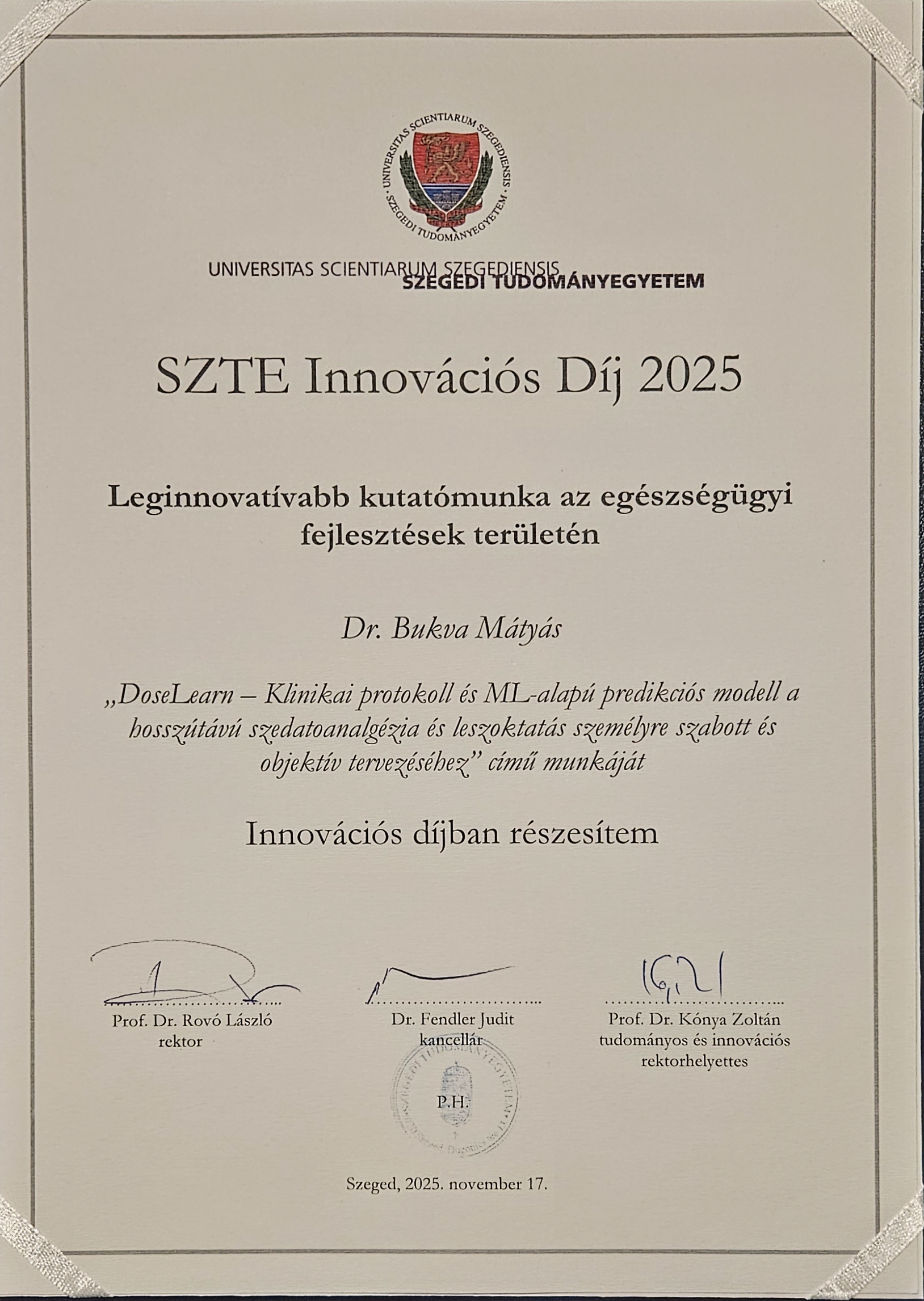 Bukva Mátyás, a HUN-REN Szegedi Biológiai Kutatóközpont Biokémiai Intézetének tudományos munkatársa is díjat vehetett át ezen az eseményen, "A leginnovatívabb munkáért az egészségügyi fejlesztések területén" kategóriában. A beadott projektmunka címe: DoseLearn – Klinikai protokoll és ML-alapú predikciós modell a hosszútávú szedatoanalgézia és leszoktatás személyre szabott és objektív tervezéséhez.