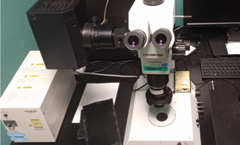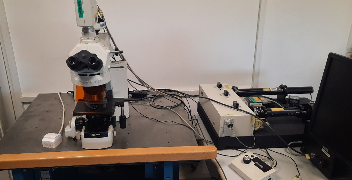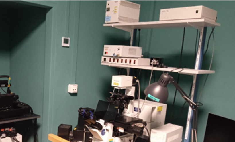 Az Olympus FV1000 konfokális mikroszkóp 6 gerjesztőlézerrel (405, 458, 488, 515, 543 és 633 nm), és 6 objektívvel (10x/0.4, 20x/0.75, 40x/1.3 OIL, 60x/1.35 OIL, 40x/0.8 W és 60x/0.9 W) rendelkezik. A képalkotáshoz használható dikroikus tükrök a következők: BS20/80, DM405/488, DM/488/543/633, DM458/515 és DM405/488/543. Képalkotó eljárás: pásztázó konfokkális leképezés, egyidejűleg 3 színcsatornán (2 spektráldetektorral) és egy emissziós filterrel rendelkező PMT-vel, valamint transzmissziós detektálás.