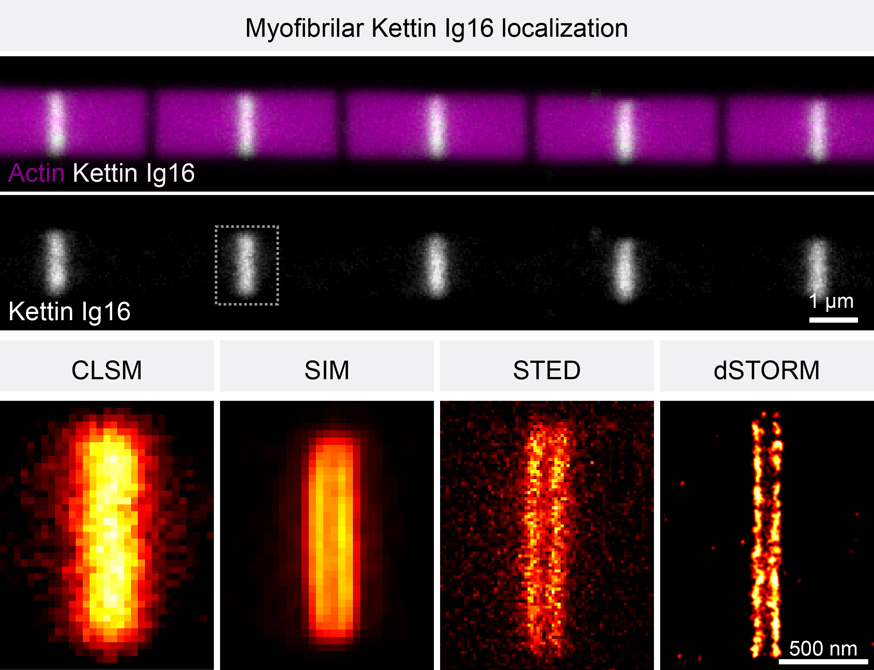 Szuperrezolúciós módszerek laterális felbontásának összehasonlítása a Z-korongban felhalmozódó Kettin fehérje példáján. A Kettin jel egyetlen sávként jelenik meg a konfokális mikroszkópos képeken, ez azonban két különálló sávra bontható fel a különféle szuperfelbontású módszerekkel.