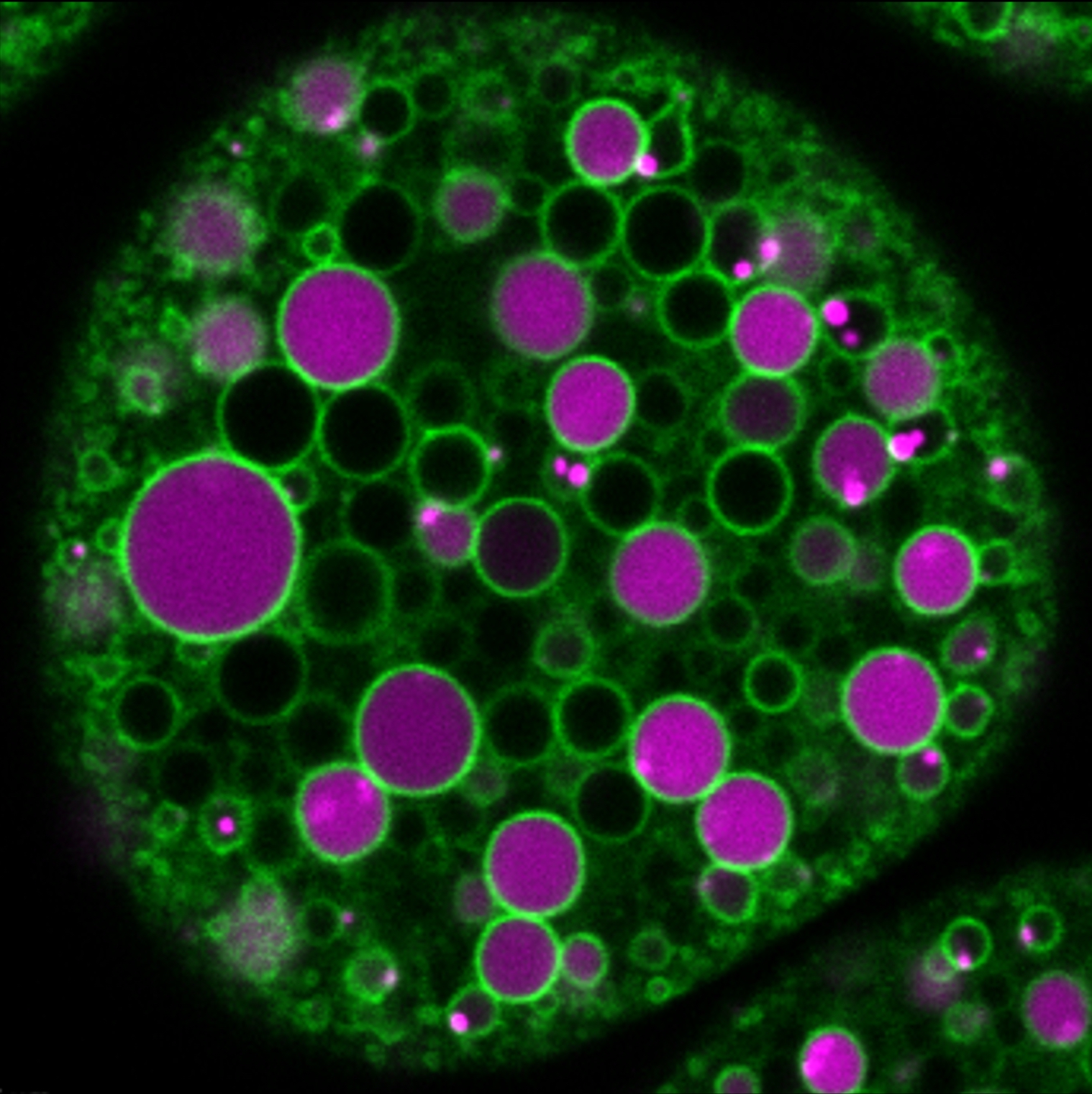3. ábra: Konfokális mikroszkópos kép egy ex vivo tenyésztett élő nefrocitáról, amely fluoreszcens jelöléssel ellátott endocitikus nyomjelzőt (magenta) és fluoreszcens jelöléssel ellátott endoszómális fehérjét (zöld) tartalmaz. A nyomjelzőt a sejt endocitózis útján felveszi a tenyésztőközegből, majd gömb alakú endoszómákba szállítja. A zöld „gyűrűk” az endocitikus vezikulumokat jelölik, mivel egy fluoreszcensen jelölt fehérje a határoló membránba kerül. Az ilyen kísérleti felállások lehetővé teszik az endocitikus transzport vizsgálatát az endocitikus szállítmány és az endoszomális érési folyamat szabályozó fehérjéinek egyidejű megjelenítésével.