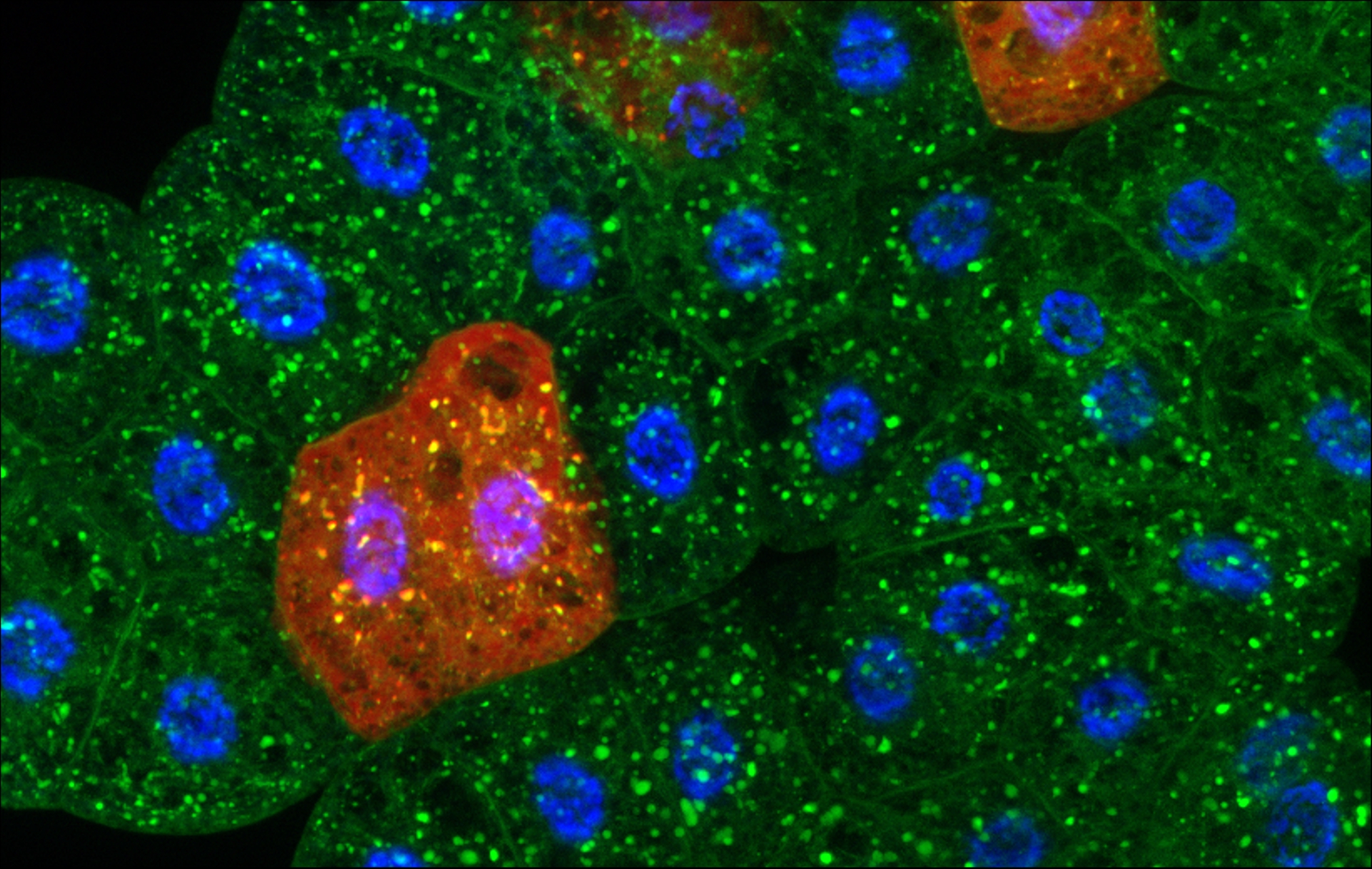 2. ábra. Éhezés által kiváltott ER-fágia genetikai mozaik módszerrel történő vizsgálata a Drosophila zsírszövetében. Ez a szerv funkcionálisan hasonló az emlősök májához és zsírszövetéhez, és éhezéses stresszre erős autofág indukcióval reagál. Ezért ebben a szövetben hatékonyan tanulmányozható az autofágia több formája, beleértve az ER-fágiát is, amely az endoplazmatikus retikulum (ER) szelektív lebontásáért felelős. A képen a Sec61-GFP (zöld) jelöli az ER-t, míg a piros színű sejtek azokat a mozaik sejtklónokat jelzik, amelyekben az egyik ER-fágia receptor gént csendesítettük.