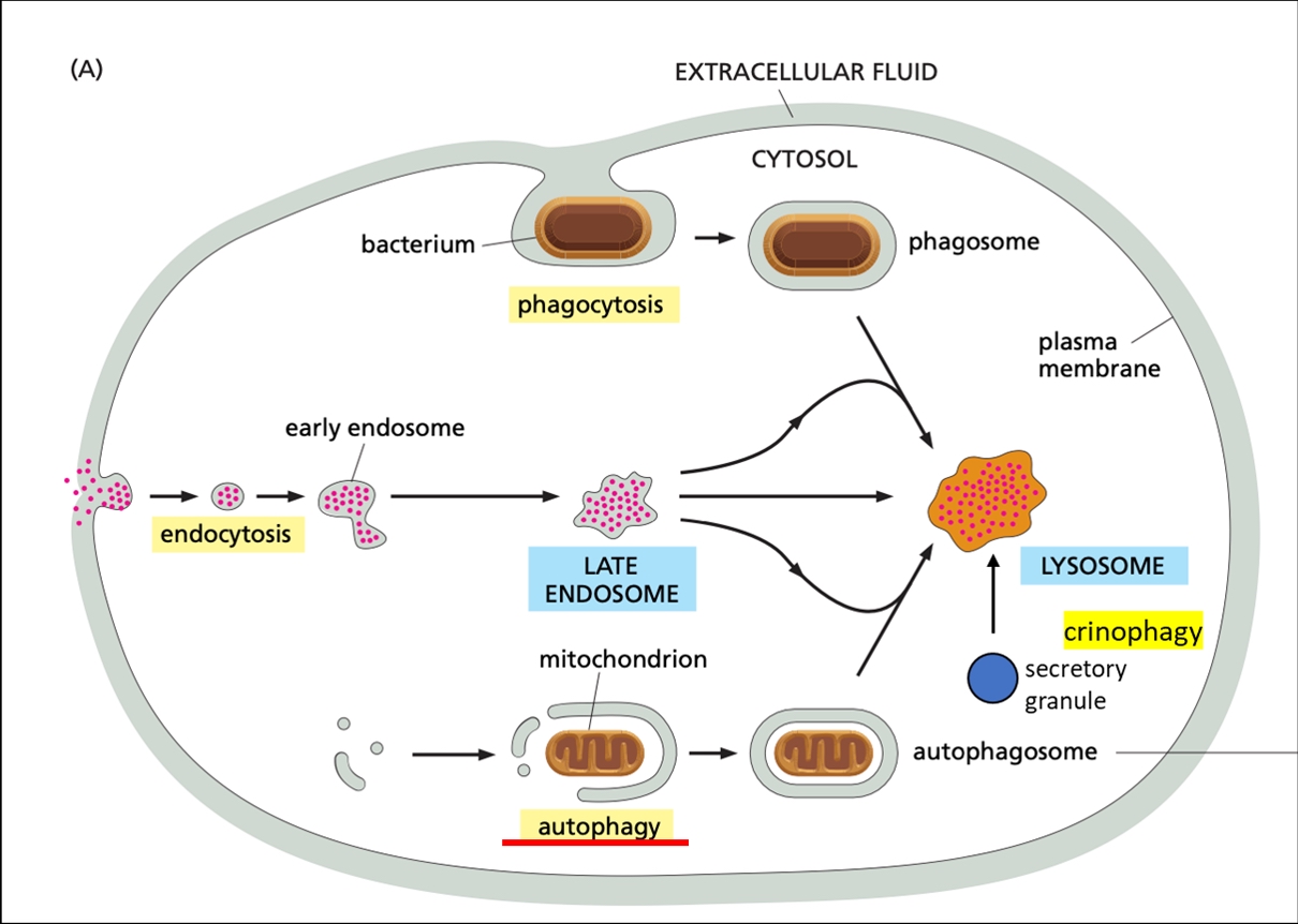 1. ábra. A lebontásra szánt anyagok fő szállítási útvonalai a lizoszómák felé. Az endocitózis felveszi az extracelluláris anyagokat, és endoszómákba csomagolja őket. A szállított anyagok általában makromolekulák és extracelluláris folyadék, továbbá a plazma membránban található receptorfehérjék. A fagocitózis egyfajta endocitózis, amely 0,5 μm-nél nagyobb részecskéket vesz fel sejtfelszíni receptorok segítségével. A lehetséges szállítmányok baktériumoktól és vírusoktól kezdve az azbeszthez hasonló inert anyagokon át a saját szervezetből származó partikulumokig, például az apoptotikus sejtekig terjednek. Az autofágia a sejten belüli komponenseket kettős membránú szállító vezikulumokba (autofagoszómákba) csomagolja, amelyek ezután lizoszómával egyesülnek. A szállítmány lehet sejtorganellum, makromolekulák és azok komplexei - többé-kevésbé véletlenszerűen kiválasztott citoplazmarészletekkel együtt. A krinofágia során a felesleges szekréciós granulumok lizoszómával történő közvetlen fúzió útján kerülnek lebontásra.