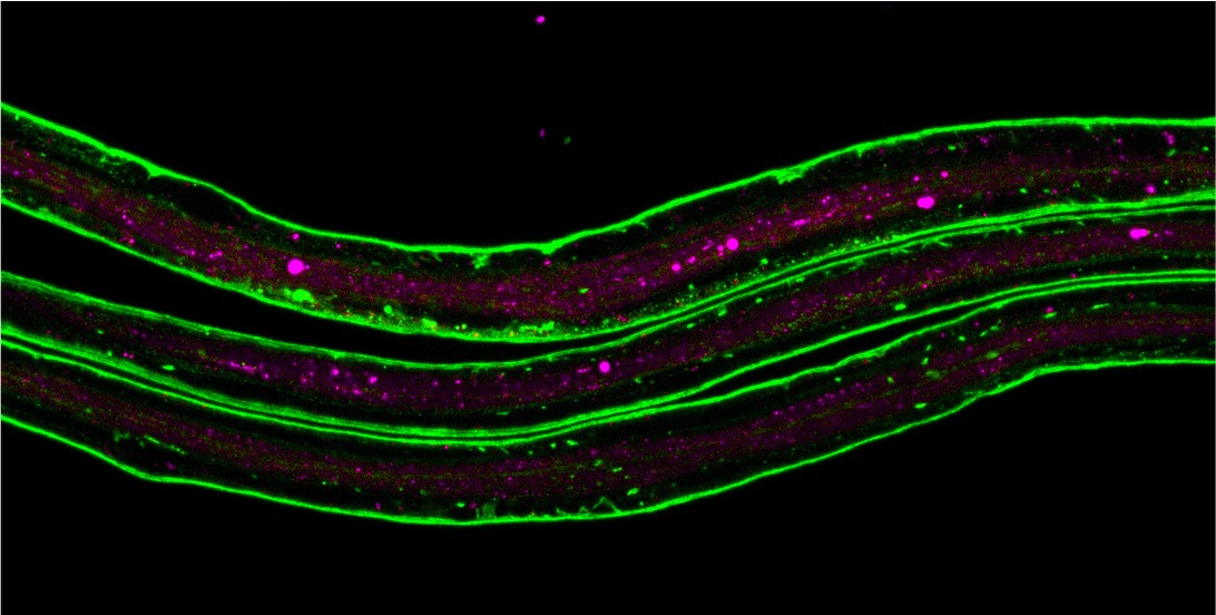 4. ábra. A képen a lárva abdominális idegei láthatók, ahol az egyik extracelluláris mátrix (ECM) fehérje, a laminin B1 zöld színnel, a gliasejtek lizoszómái pedig magenta színnel vannak jelölve. Ezt a rendszert használjuk annak feltárására, hogy a gliasejtek hogyan alakítják át ECM környezetüket a normális fejlődés során, illetve sérülés után a felesleges mátrix eltávolításával. A Drosophilában rendelkezésre álló hatékony genetikai eszközök segítségével szűrőrendszereket hoztunk létre a mátrix felvétel kulcsfontosságú tényezőinek azonosítására, amelyeket tovább vizsgálhatunk, hogy az ECM fragmensek fagocita által közvetített bekebelezésének mechanizmusát megértsük.